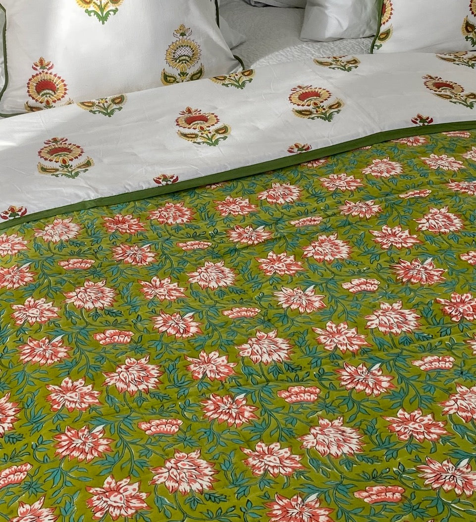 La courtepointe est un best seller chez BloomParis. Nos courtepointes sont des couvertures matelassées qui recouvrent les trois quarts de votre lit, du bout de votre lit jusqu’aux oreillers. Elles sont fabriquées dans notre atelier de Pondichéry. Cousues avec soin à la main, elles apporteront moelleux et confort à votre lit. Elles sont toujours recto-verso, vous pouvez ainsi en changer de côté quand vous le souhaitez pour changer de décor!