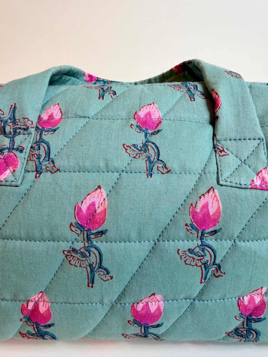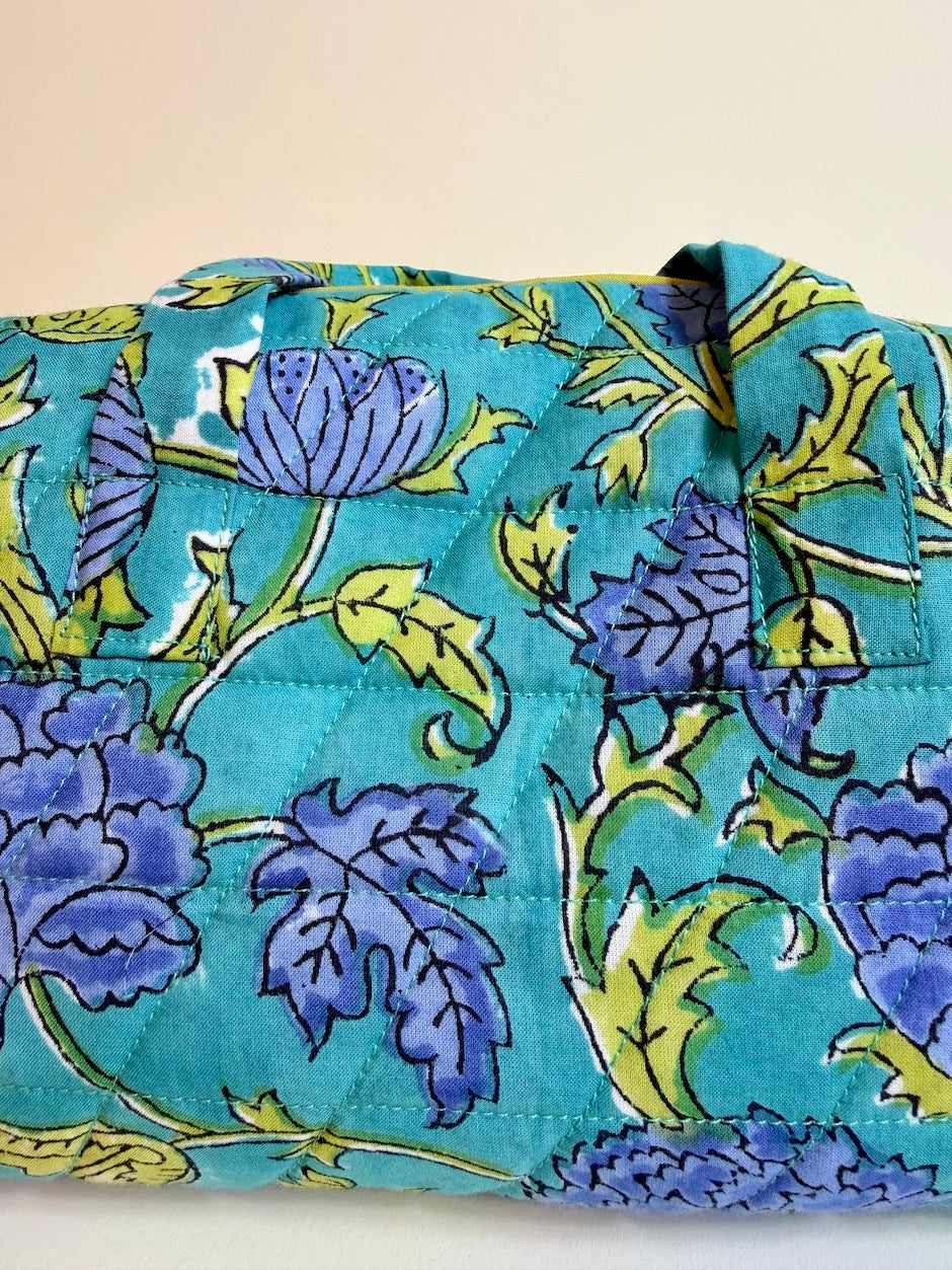 Our quilted cotton toiletry bags are made in Paris. They are incredibly practical with their two handles, just like a vanity case. Available in three sizes, they are perfect for storing beauty products or even your underwear... Their large capacity allows you to take your bathroom essentials with you, even on long trips.