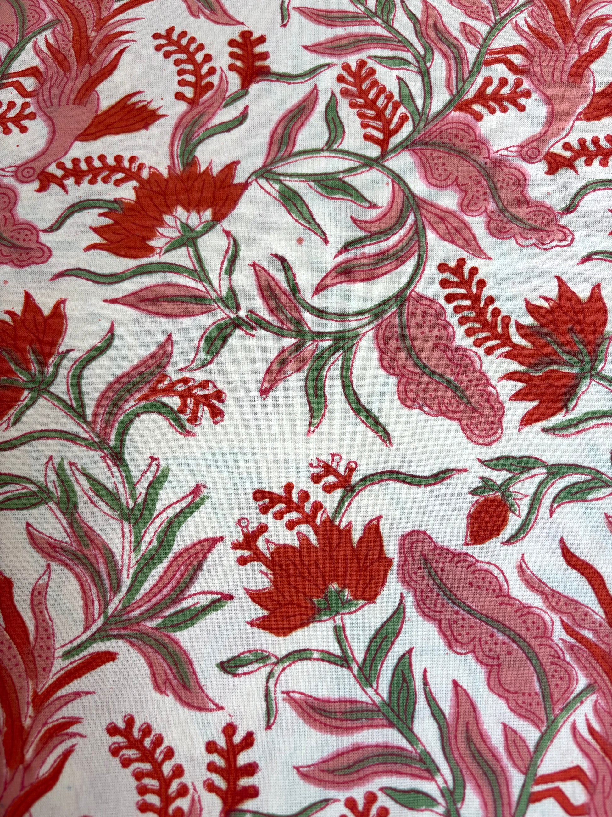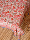 At the intersection of traditional craftsmanship and contemporary design, our block-printed cotton tablecloths transform every meal into a celebration of color and sophistication. The Jasmin tablecloth, with its vermillion-red flowers and birds on a white background, will add a touch of zest to your meals and your home.
