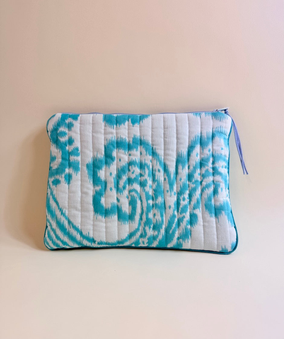 This large flat Ikat pouch is perfect for storing all your papers, money, makeup, medication, keys, and more. It's quilted, trimmed with piping, and hand-sewn in our Parisian workshop. It's also the perfect little gift.