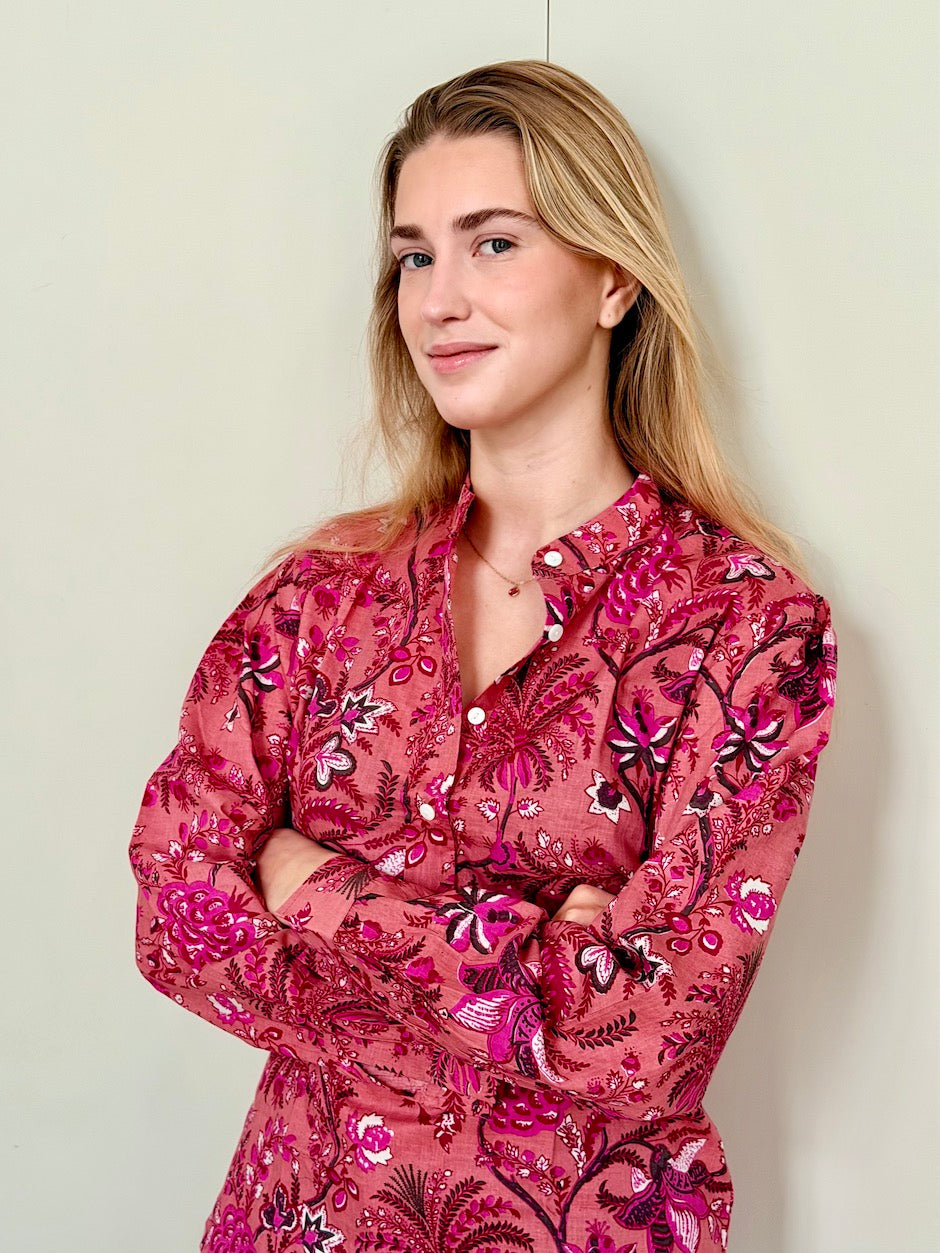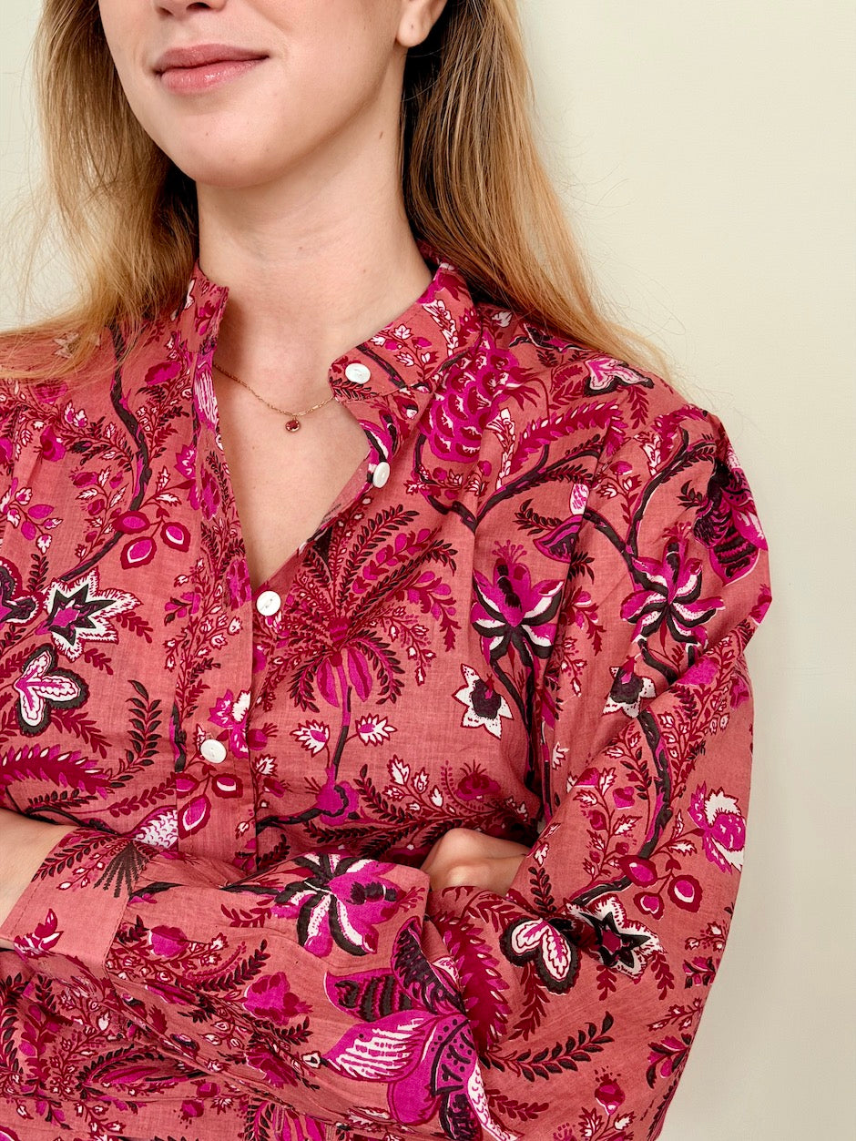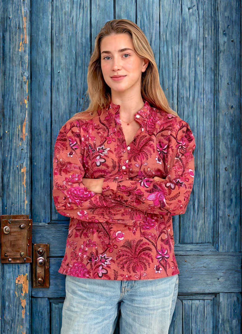 Notre chemisier Angélique est 100% coton. Vous l'apprécierez pour sa douceur, sa respirabilité et son confort. Il est à manches longues avec un col Mao et idéal toute l'année: l'hiver pour donner de l'élégance sous un pull, l'été pour donner de la couleur à votre silhouette.