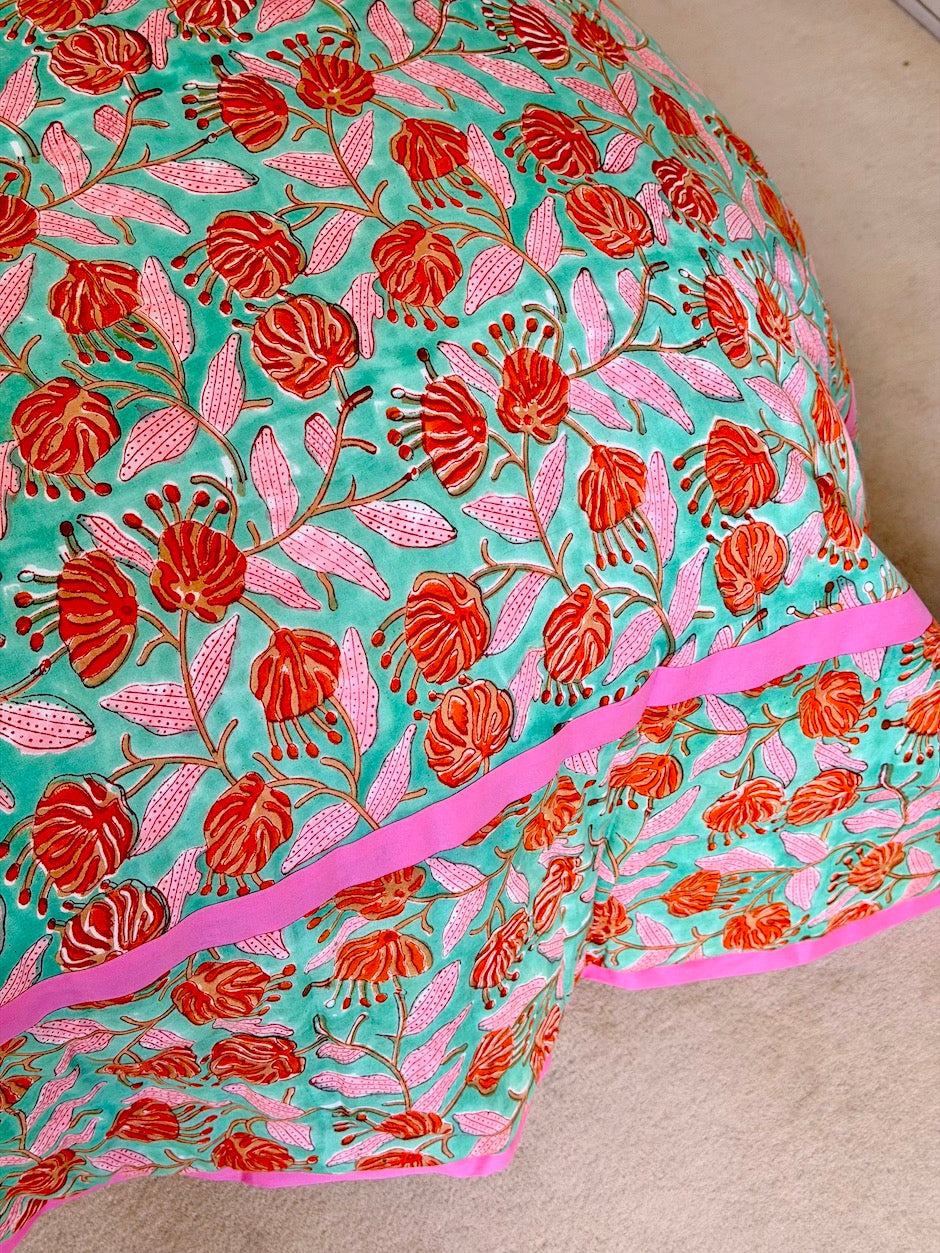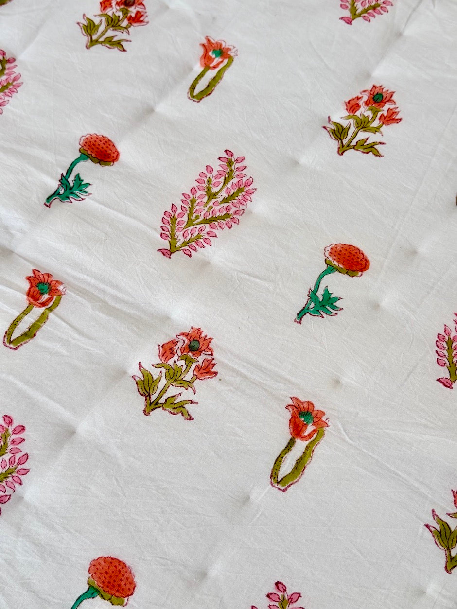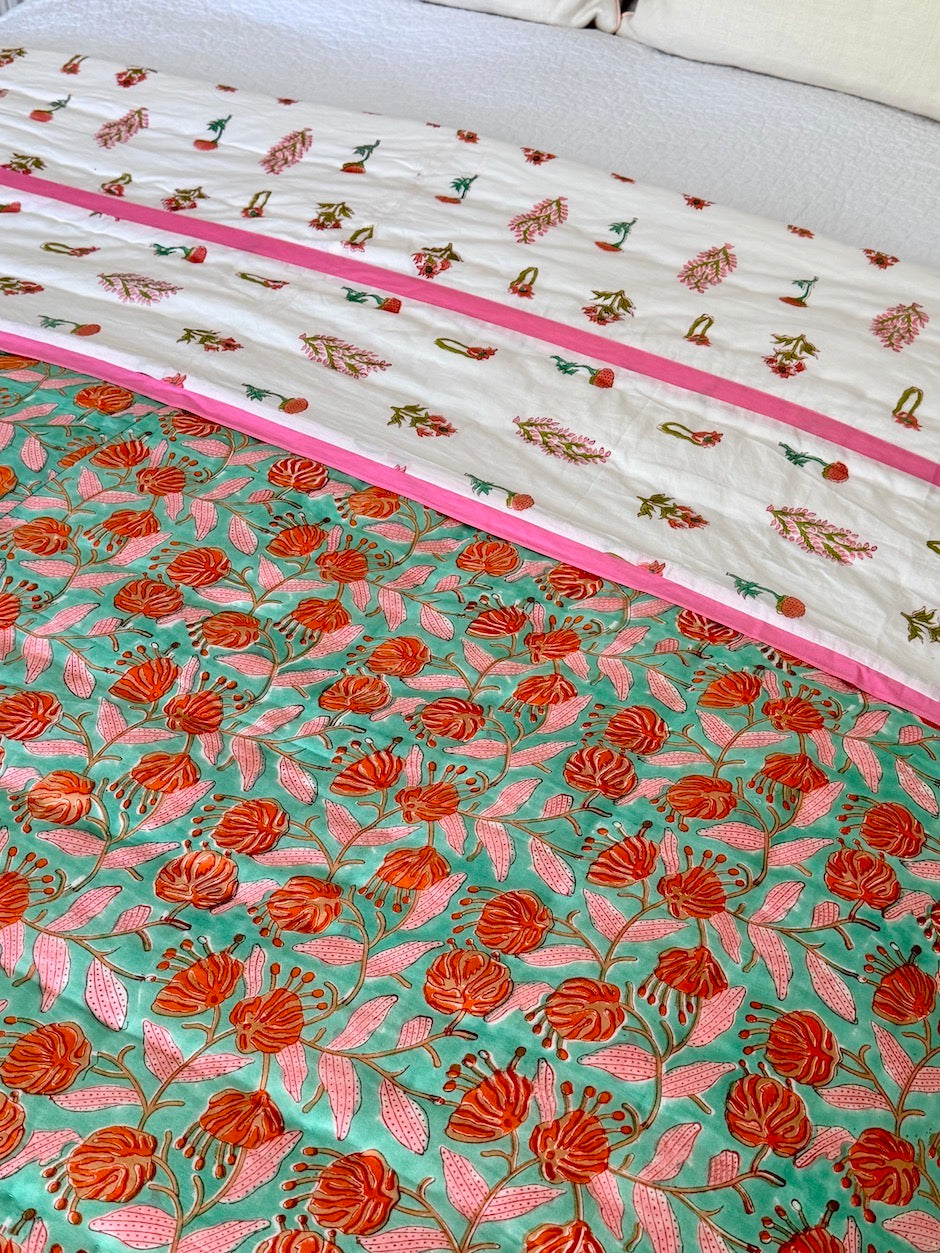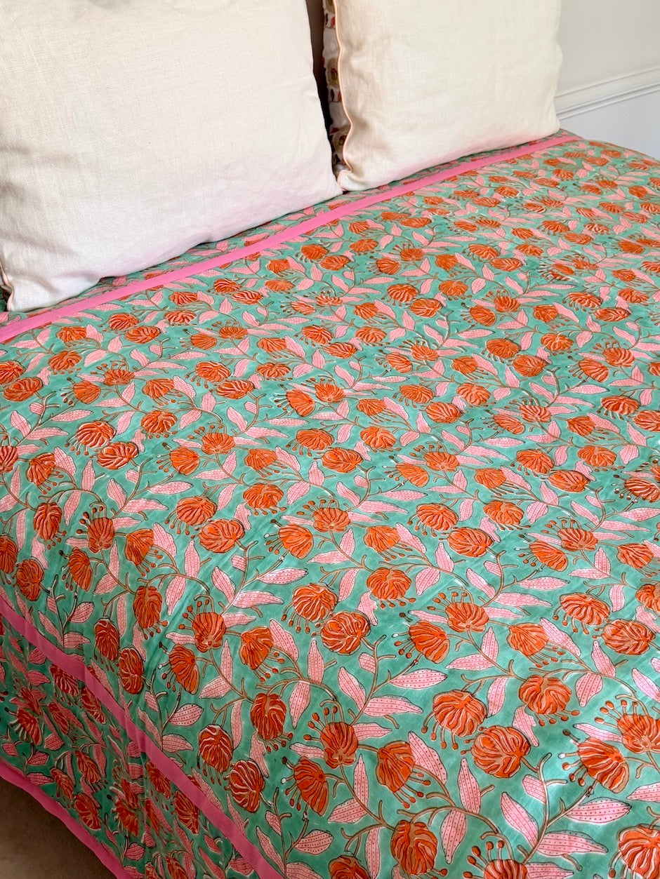 Notre dessus de lit Mandarine est matelassé et quilté à la main. C'est un couvre lit moelleux et archi confortable. Il est réversible et peut être utilisé des deux côtés, tout au long de l'année. Ses couleurs vives apporteront une touche de peps à votre lit et à votre chambre.
