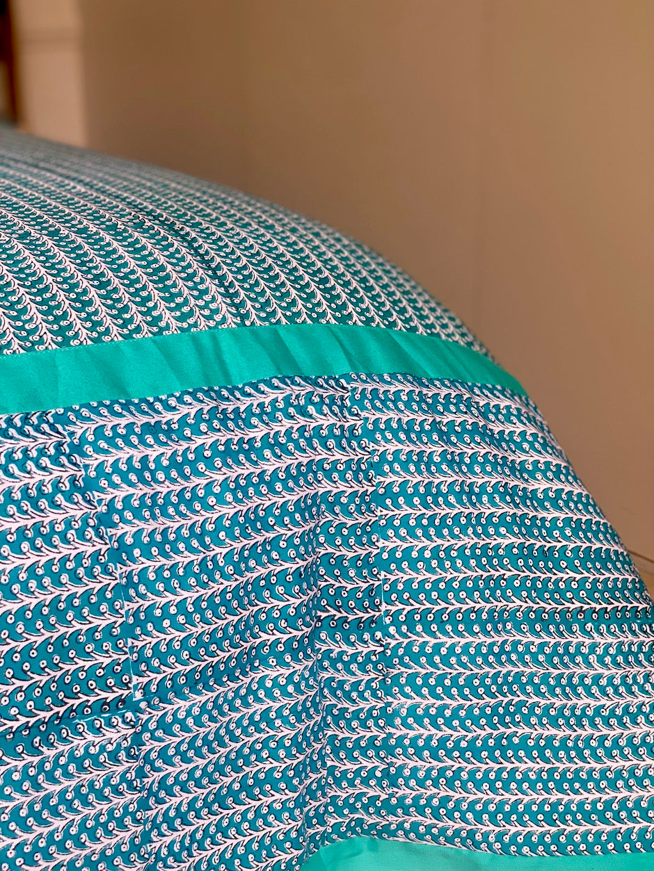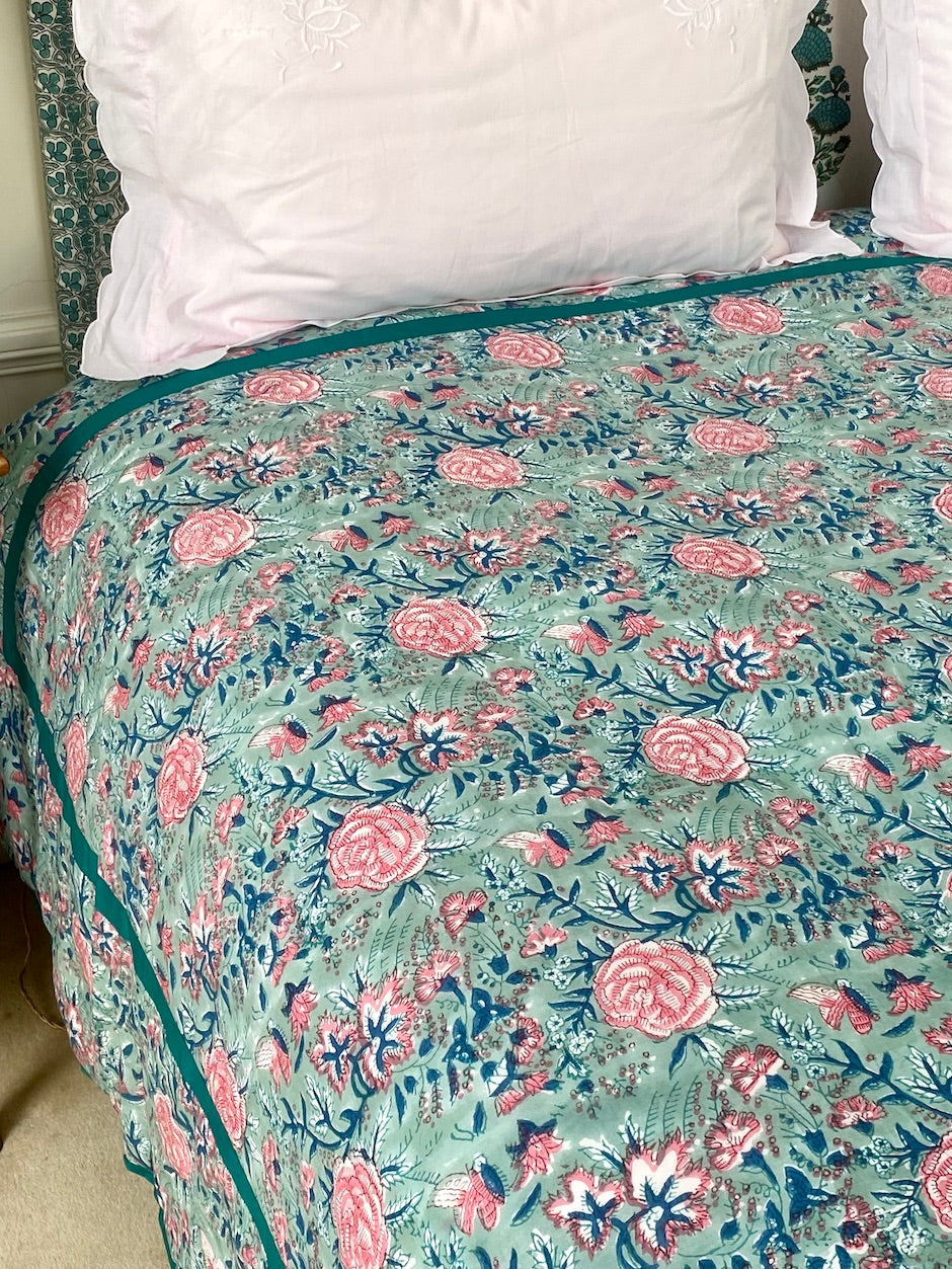 Notre dessus de lit Pivoine est matelassé et quilté à la main dans notre atelier de Pondichéry. C'est un couvre lit moelleux et archi confortable. Il est réversible et peut être utilisé des deux côtés, tout au long de l'année. Ses couleurs donneront de la douceur à votre lit et à votre chambre.
