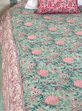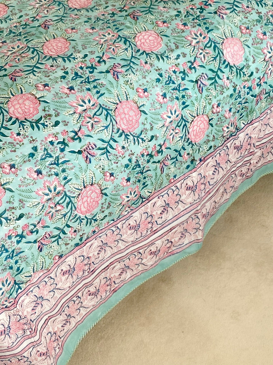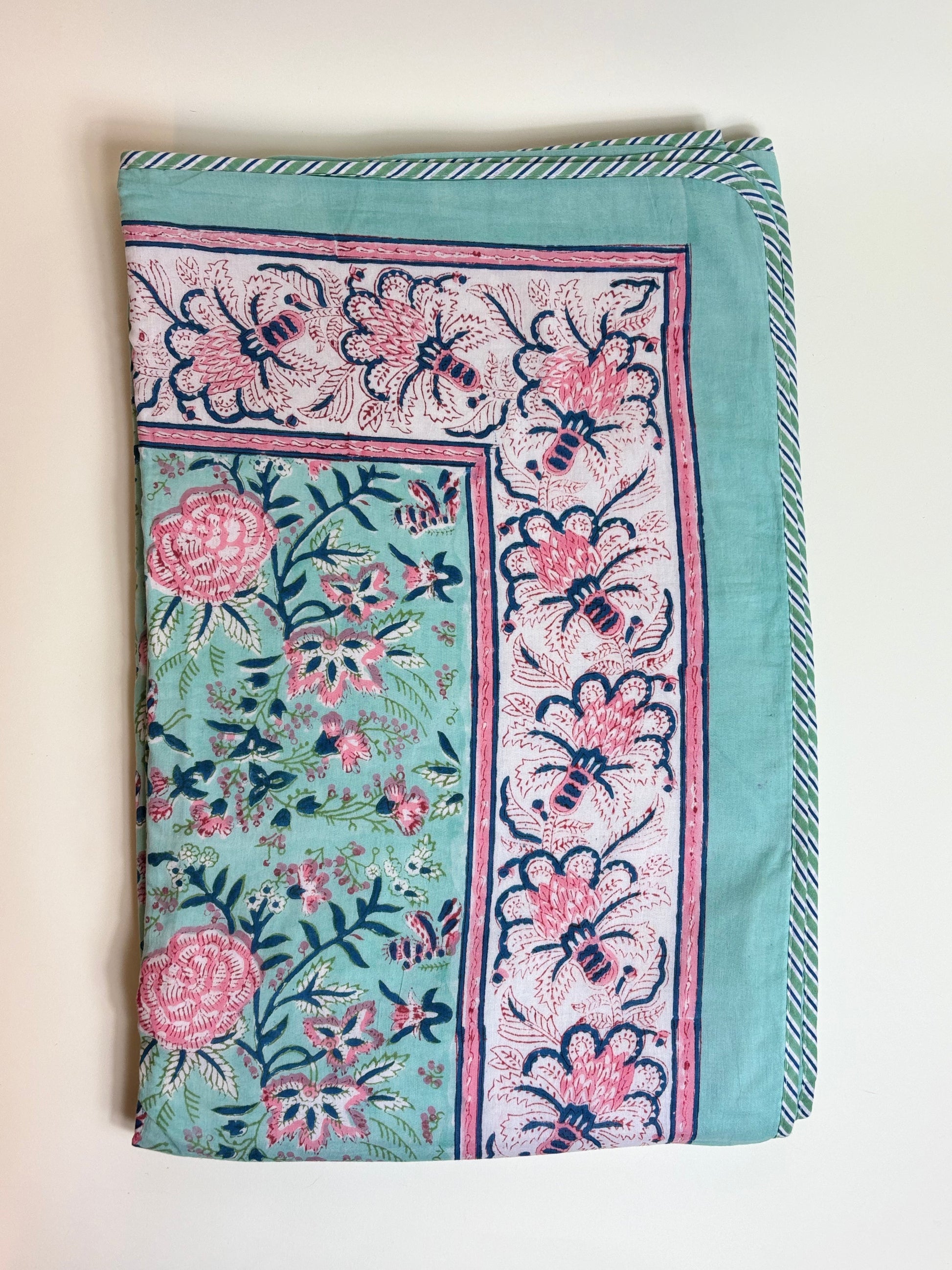 Notre dessus de lit Pivoine Turquoise est fabriqué avec 3 couches de mousseline de coton cousues ensemble. Il est réversible et peut être utilisé des deux côtés, en été comme lors d'un hiver doux. Ses couleurs rose et turquoise donneront du peps à votre lit et à votre chambre.