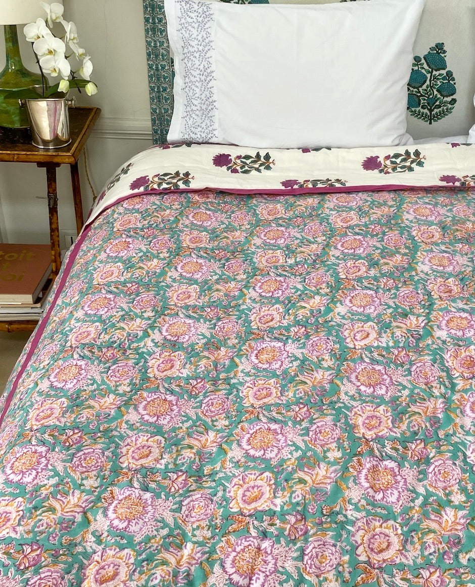 Notre dessus de lit Rosemary est matelassé et quilté à la main dans notre atelier de Pondichéry. C'est un couvre lit moelleux et archi confortable. Il est réversible et peut être utilisé des deux côtés, tout au long de l'année. Ses couleurs donneront de la douceur à votre lit et à votre chambre.