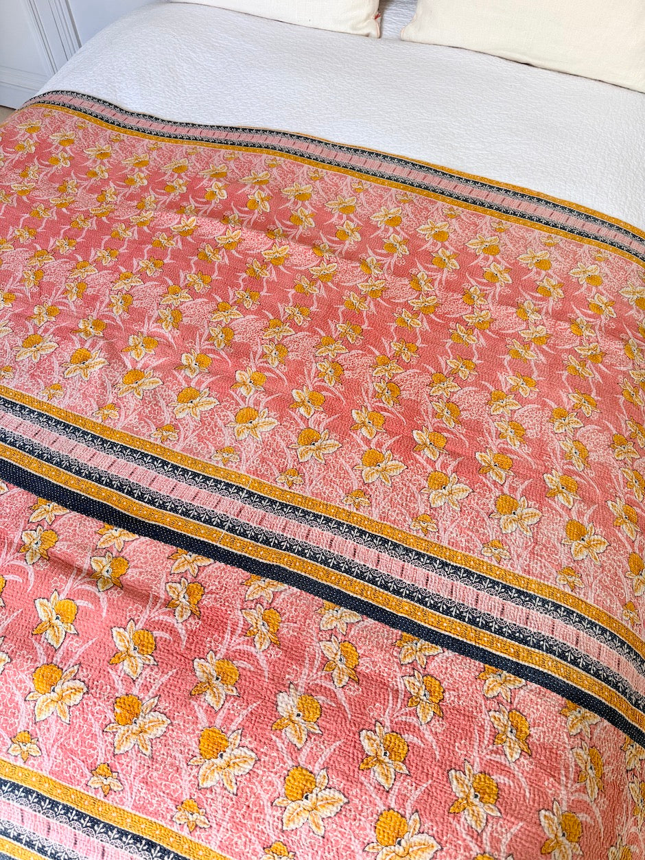 Ce très beau jeté de lit s'appelle un kantha. Un simple point de couture courant est utilisé pour assembler plusieurs couches de saris en coton. Le Kantha est souvent réalisé par des femmes et est transmis de génération en génération. C'est un artisanat qui valorise le recyclage et la réutilisation des tissus. Cet assemblage de tissus laisse libre court à une très belle variété de couleurs. C'est un textile extrêmement décoratif, à jeter sur un lit, un canapé ou encore à exposer sur un mur. Il est toujours réversible.