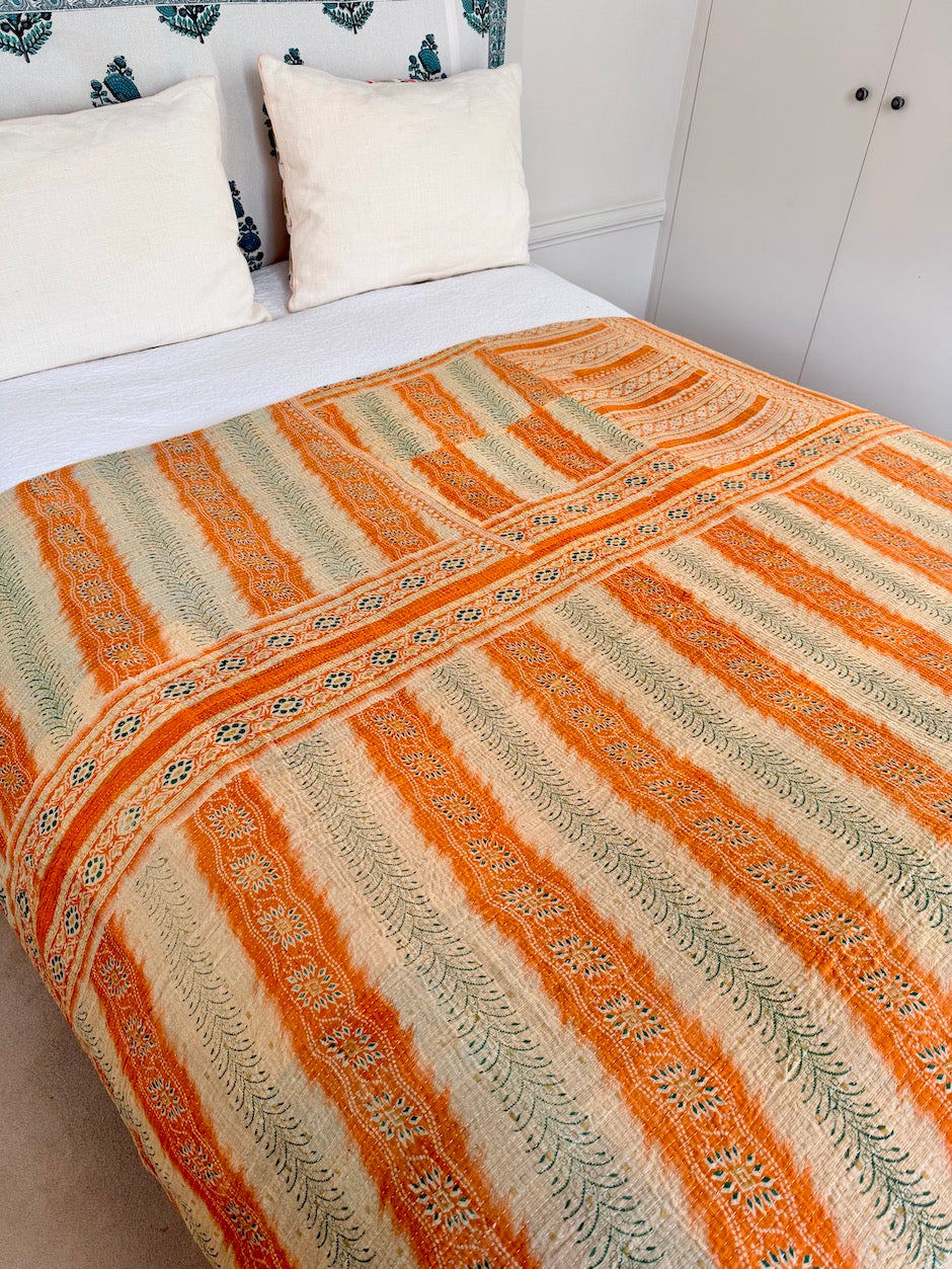 Ce très beau jeté de lit s'appelle un kantha. Un simple point de couture courant est utilisé pour assembler plusieurs couches de saris en coton. Le Kantha est souvent réalisé par des femmes et est transmis de génération en génération. C'est un artisanat qui valorise le recyclage et la réutilisation des tissus. Cet assemblage de tissus laisse libre court à une très belle variété de couleurs. C'est un textile extrêmement décoratif, à jeter sur un lit, un canapé ou encore à exposer sur un mur. Il est toujours réversible.