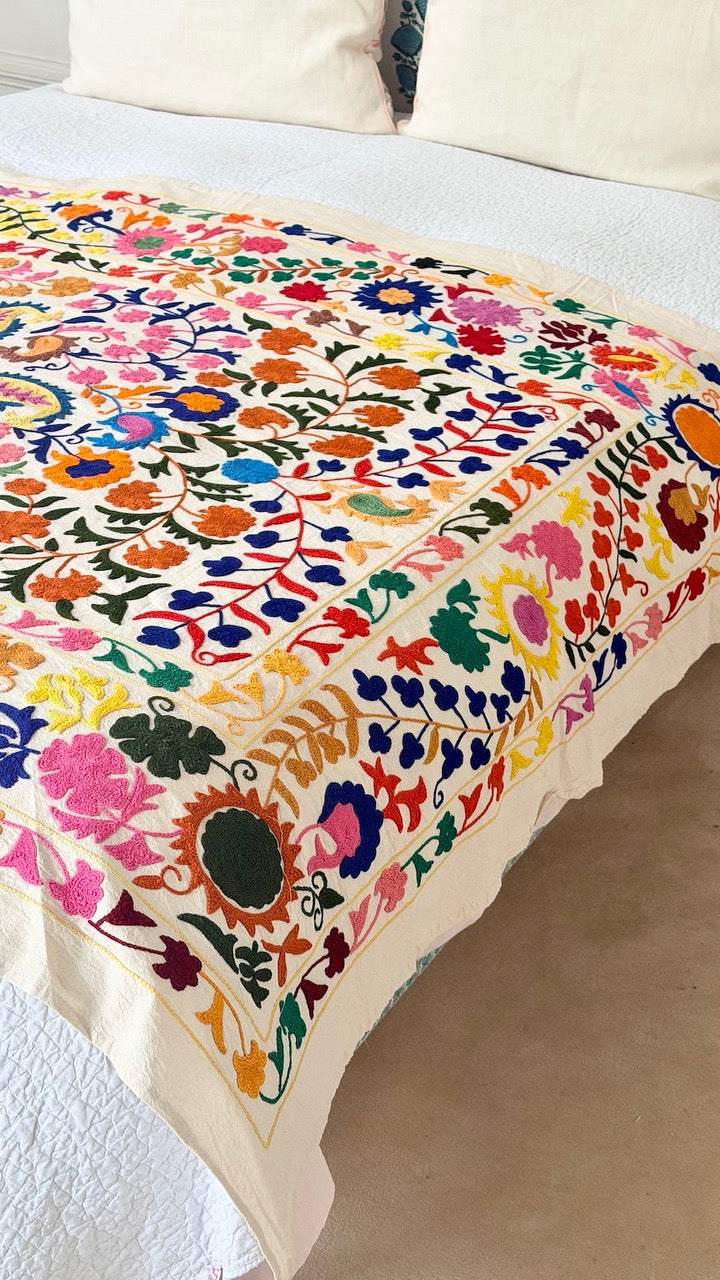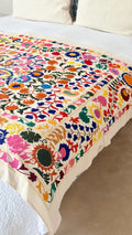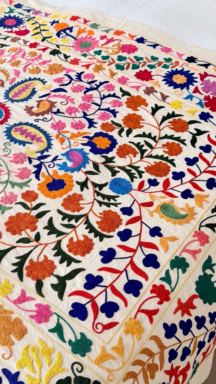 Le jeté de lit Feuille de Chêne est un suzani. C'est un textile brodé originaire d’Asie centrale. Celui-ci vient d’Ouzbékistan. Ce sont des pièces artisanales uniques souvent réalisées en deux, voire en plusieurs morceaux, cousus ensemble par la suite. Les coutures sont donc apparentes et des traces de crayon peuvent apparaître sur le tissu car elles en sont la trame. Ce suzani est un véritable objet de décoration pour votre lit, votre chambre, votre canapé ou encore exposé sur un mur.