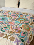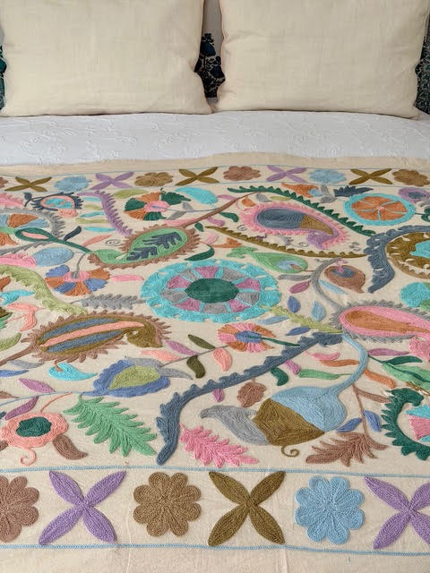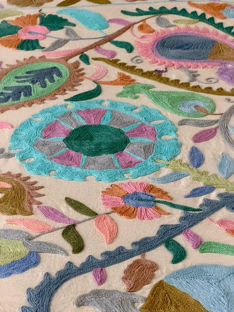 Le jeté de lit Pecan est un suzani. C'est un textile brodé originaire d’Asie centrale. Celui-ci vient de Jaipur. C'est une version moderne des suzanis anciens qui viennent en général d'Ouzbékistan. Il est brodé à la machine, c'est un véritable objet de décoration pour votre lit, votre chambre, votre canapé ou encore exposé sur un mur. Ses couleurs pastels avec des touches de peps apporteront beaucoup d'énergie et d'élégance à votre intérieur.