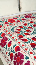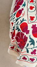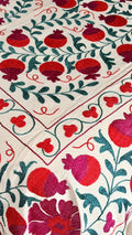 Le jeté de lit Pomegranate est un suzani. C'est un textile brodé originaire d’Asie centrale. Celui-ci vient d’Ouzbékistan. Ce sont des pièces artisanales uniques souvent réalisées en deux, voire en plusieurs morceaux, cousus ensemble par la suite. Les coutures sont donc apparentes et des traces de crayon peuvent apparaître sur le tissu car elles en sont la trame. Ce suzani de grande taille est un véritable objet de décoration pour votre lit, votre chambre, votre canapé ou encore exposé sur un mur.